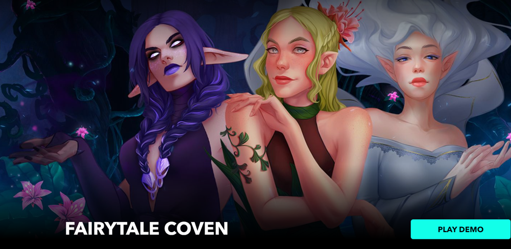 • Play Mode - Fairytale Coven is a 5x3 reel video slot game with 15 paylines, Wild symbols, Aerial Magic, Nature Magic, Dark Magic features, and Risk and Buy options.
