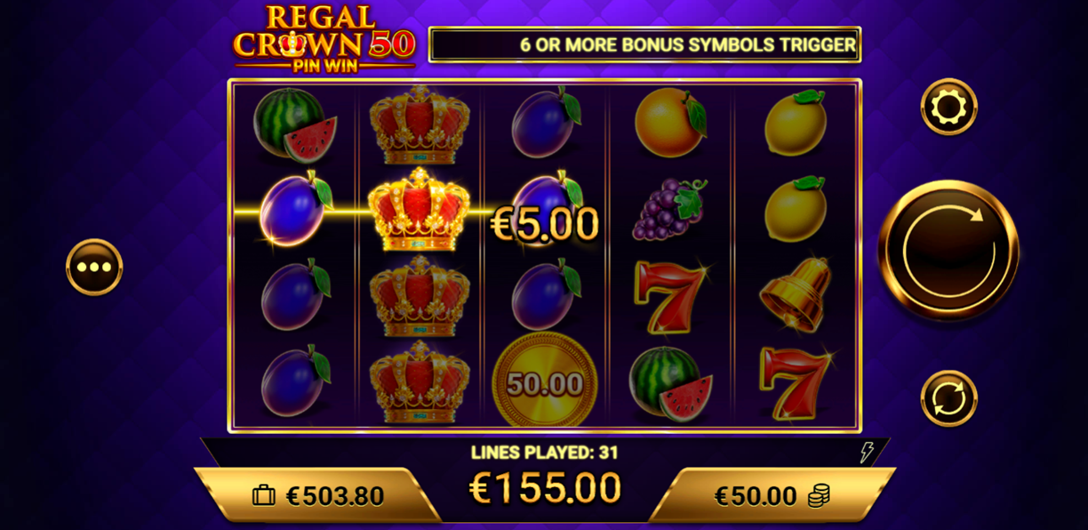 • Play Mode – Regal Crown 50 is a 5x4 reel video slot game featuring 50 paylines, a Maximum Multiplier of x1000, Wild, Scatter, and Bonus symbols, Pin Win Bonus, and Pin Win Bonus Game.