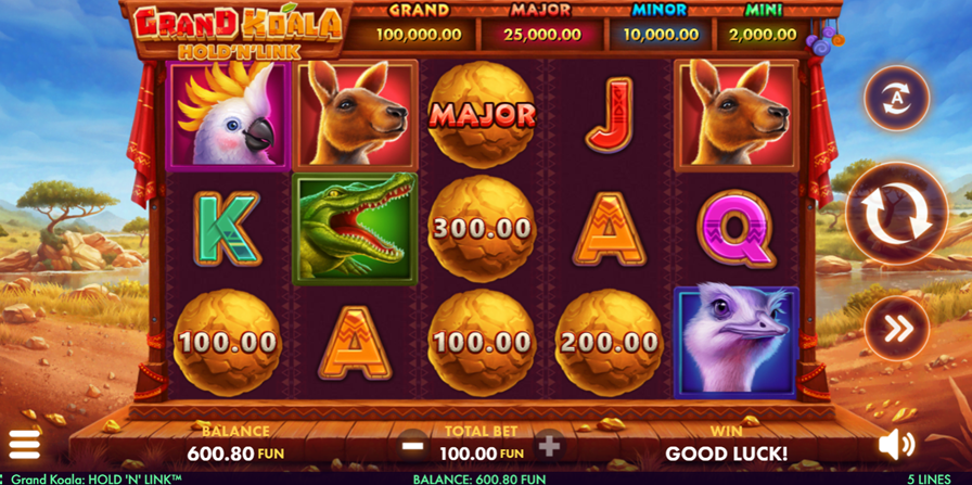 - Play Mode – Grand Koala: Hold ‘n’ Link is a 3x5 reel video slot game with 5 paylines, Koala Wild, Scatter, and Cash Sphere symbols, Free Spins Bonus, Hold ‘n’ Link Bonus, and Jackpot Features.