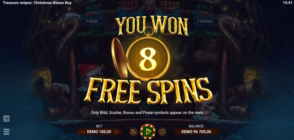 • Play Mode - Treasure-Snipes: Christmas Bonus Buy is a 5x3 reel video slot game with 20 paylines and Free Spins, Bonus Game, and Mini, Mega, and Super Jackpots.