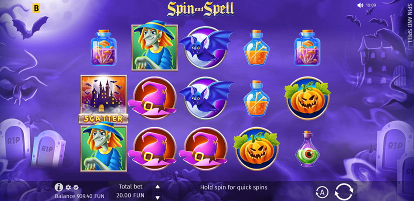 Spin and Spell has spooky scatter symbols, expanding wild symbols, and a boo-tiful potion bonus game.
