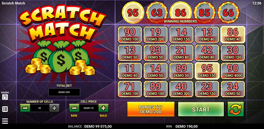 • Play Mode – Scratch Match is an instant game with a Lottery Feature where you place your bet and then Scratch the Card. You can choose to play with 10 or 20 active cells. The result of the bet is announced at the end of the round.
