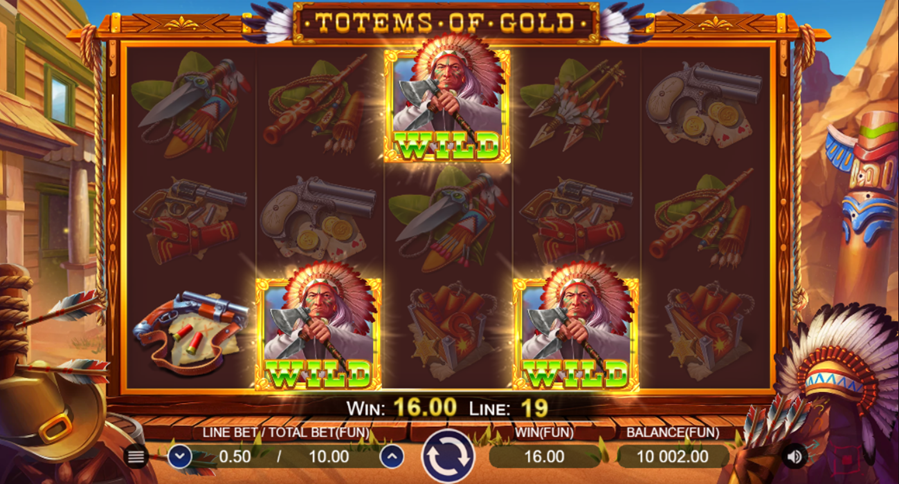 - Play Mode – Totems of Gold is a 5x3 reel video slot game with Wild Big Chief, Two Sets of Scatters, and Totem Pole Bonus symbols, Cowboy Free Spins, and Totem of Gold features.