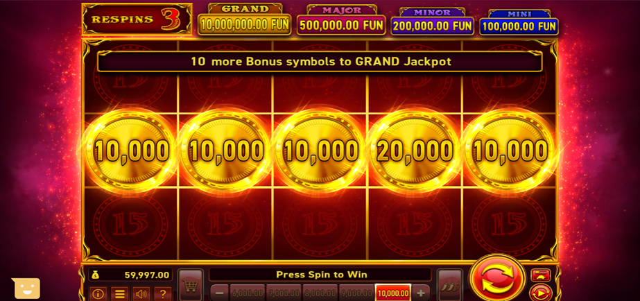- Respins – 3 Respins are given at the beginning of the Bonus Game. Each new Bonus symbol resets the number of Respins to 3.