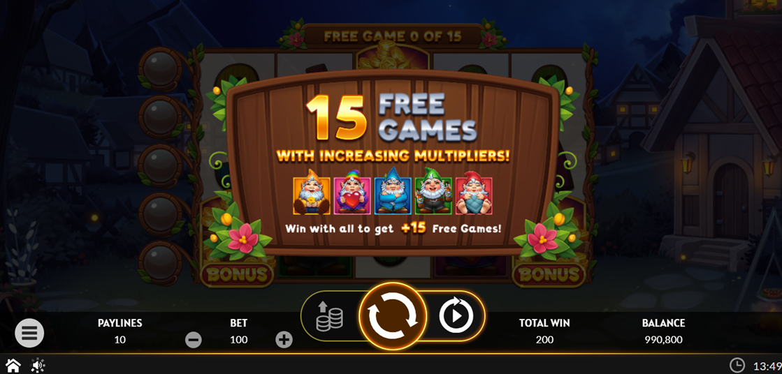 • Free Game Feature - Only Gnome symbols appear on the reels during Free Games. Each Gnome unlocks a personal multiplier for the rest of the Free Games series. The multiplier is multiplied If the same Gnome appears during the Free Games. If all 5 Gnomes unlock their personal multipliers, an additional 15 Free Games are awarded.