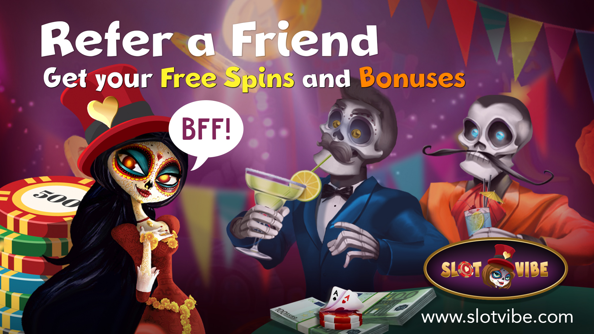 Real friends always have our backs. In this case, your tribe can help you get Free Spins and extra bonuses. Share all the SlotVibe Online Casino fun with your besties and, in turn, get 20 No Deposit Free Spins on Lady Muerta in SlotVibe for EACH friend that joins us and completes their Welcome Offer. Once you have referred 5, 10 and 20 friends, this is what you can get: