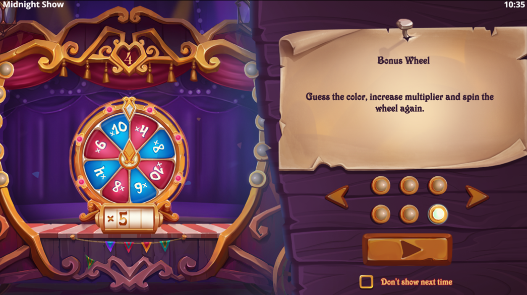 - Bonus Wheel – When the Bonus Wheel appears, the player must guess the colour to increase the multiplier to spin the wheel again.