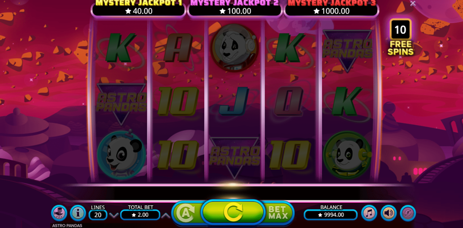 Enjoy a Panda space adventure with Astro Pandas. In this outer space odyssey from Booming Games, you can double your wins with Free Spins. Play Astro Pandas to have a chance to float the 3 Mystery Jackpots back to earth. The Mystery Jackpot awards up to x500 of the base bet. Purr!