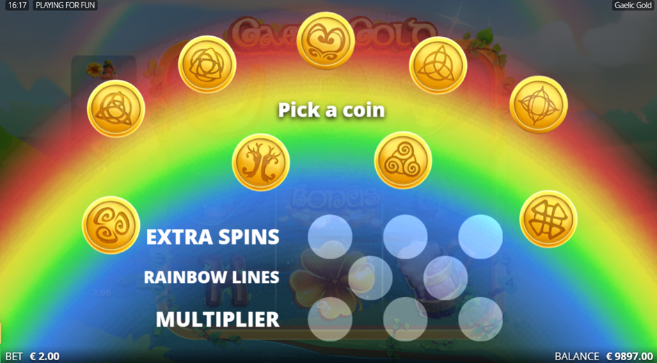 Gaelic Gold has a xNudge Factor, which increases the Multipliers when the Leprechaun Expanding Wild Multiplier appears on the screen. Use the NoLimit Bonus Buy features that make hunting for the Bonus Rainbow Spins incredibly easy. The Bonus Rainbow Spins allow you to Pick Coins for Extra Spins, with up to x9,800 of your bet up for grabs, in this rewarding Irish Slot Game from NoLimitCity.
