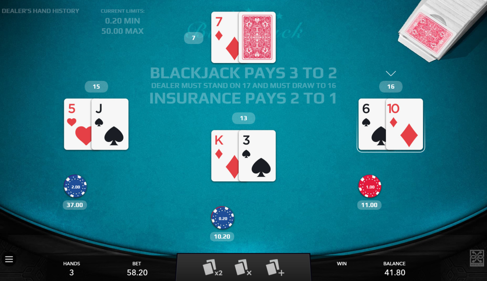 - Three Hands Table Game – The Three Hands Table Game feature allows players to make 3 bets and strategize like at a real casino.