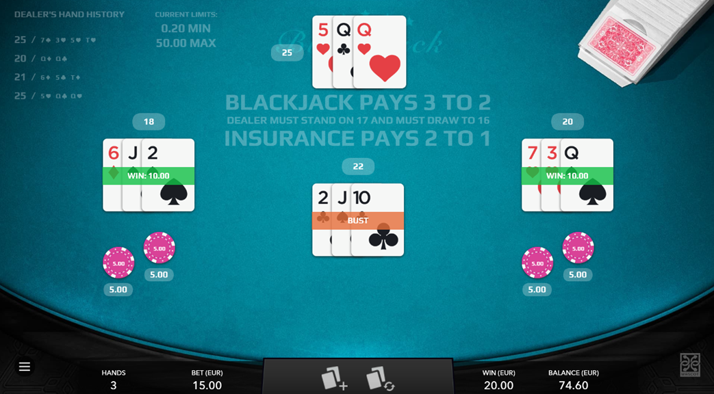 - Minimum and Maximum Bet – Black Jack has a minimum bet of 0.20 and 50.00 as a maximum bet.