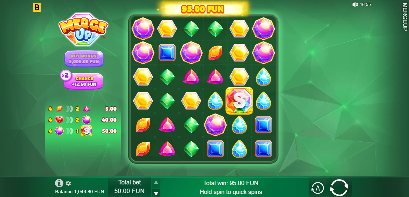 - 97.25% RTP (Return to Player) – The RTP is 97.25% on Merge Up with a Hit Rate of 3.04, a Maximum Multiplier x5000, and a Maximum Win of €250 000.