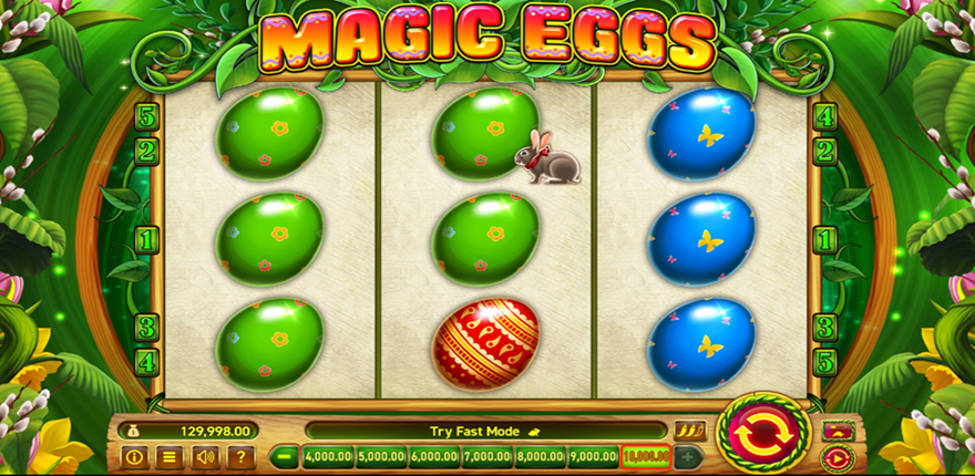 • Play Mode - Magic Eggs is a 3x3 reel video slot game with 5 paylines, Adjustable Volatility Levels, a Unique Gamble Feature, and a Special symbol.