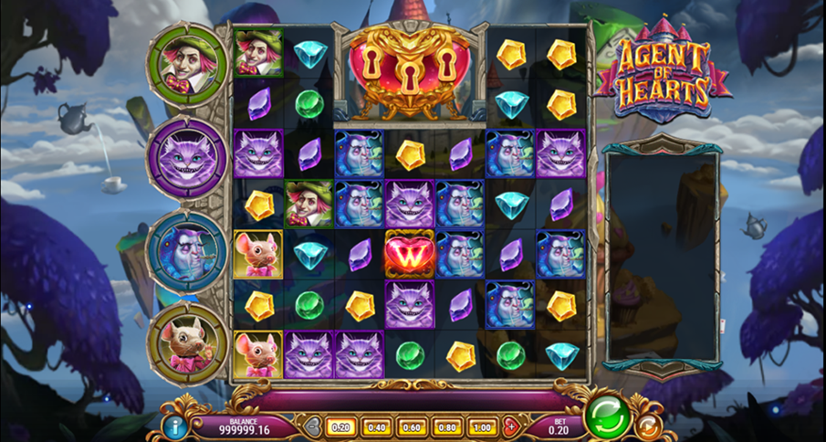 • Play Mode – Agent of Hearts is a cascading reel video slot game with cluster paylines, Random Heart Wilds, Queen’s Heart, Keys, Agent features, Mad Hat, Grinning Cat, Smokin’ Phat, Cup Cake Splat, and Queen’s Heart Free Spins features.