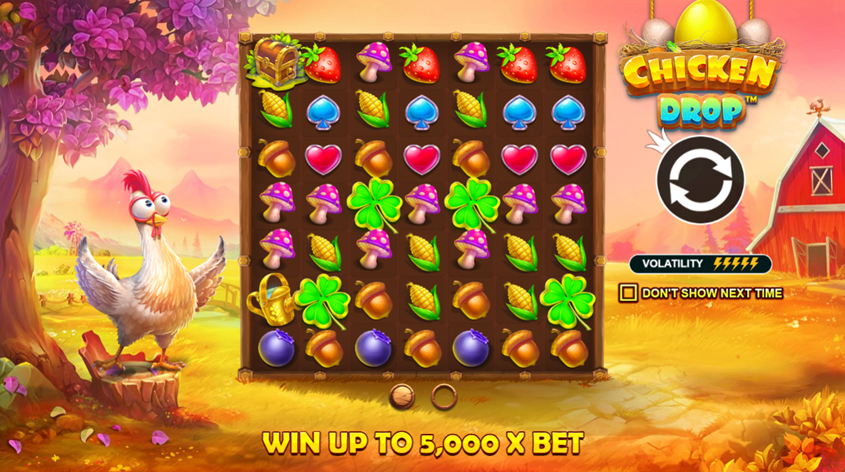 - Play Mode - Chicken Drop is a 7x7 reel video slot game with Shamrock and Watering Can Multipliers, Tumble Feature, Progressive Feature, Free Spins, a Buy Feature, and a Maximum Multiplier of x5,000.