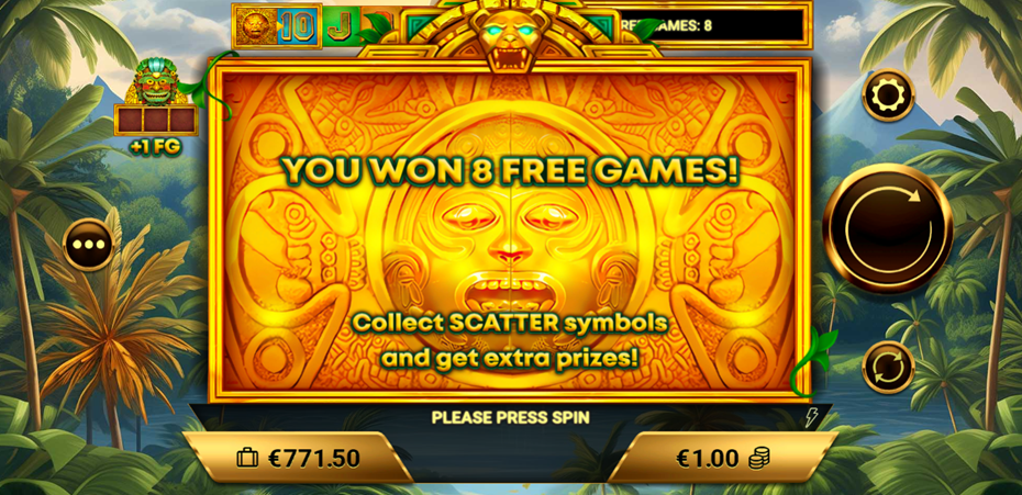 The Free Spins games are hot, and the more Scatters that collect, the more I can spin with the Free Games in Jaguar Treasures. The Monkey, Toucan, and Frog all keep a watchful eye for the magnificent Jaguar as the ancient Mayan Masks and Mystery Symbols stack up to create exciting wins. I love the Buy Bonus Button, as it makes more Free Games. Purr!