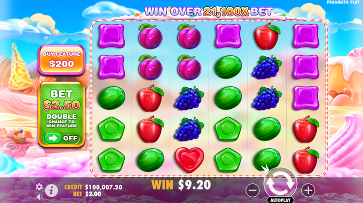 Sweet Bonanza will sweeten your gameplay with exploding fruit and sweets that sparkle on the candy land grid. The sticky tumbling symbols make tinkling sounds as the clouds drift by in the breath-taking candy land background. This slot game brings good odds of winning, and by using the buy feature, it allows you to get splendid free spins instantly for 200.00. While you watch the symbols tumble into place, you can up the ante bet to increase the honied excitement of Sweet Bonanza. You can only up the ante when not using the buy feature.