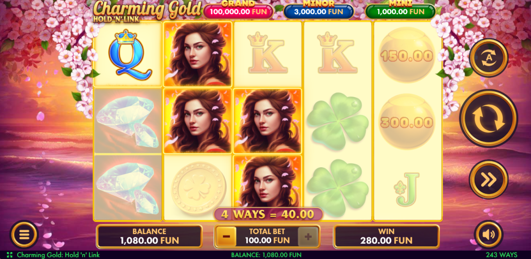 - Play Mode – Charming Gold: Hold 'n' Link is a 5x3 reel video slot game with 243 paylines with Burst, Wild and Golden Sphere symbols and a Burst and Hol ‘n Link feature.